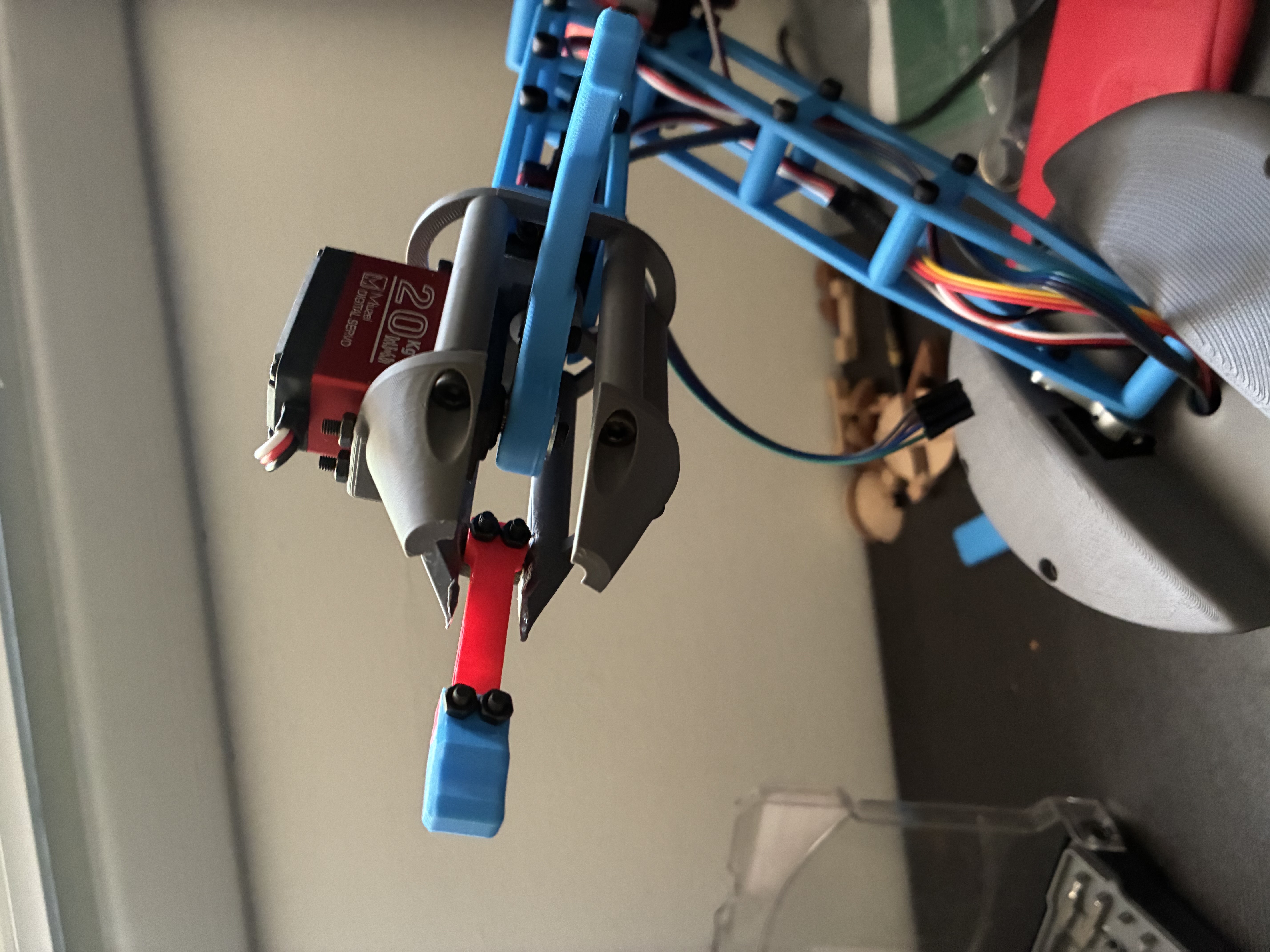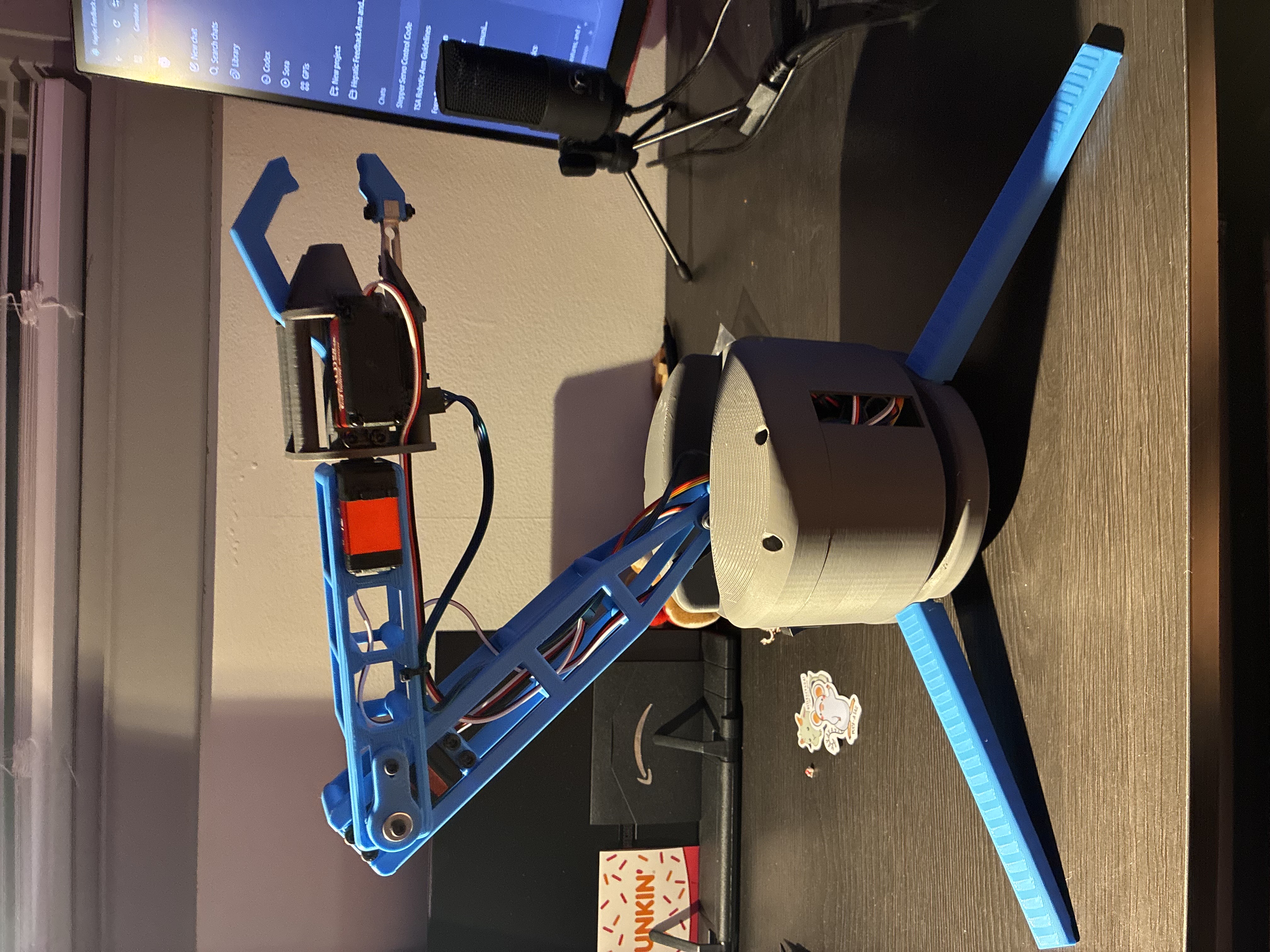 - After our project was approved and the funding was secured, I ordered all the required components for the build. While waiting for the shipments to arrive, I 3D-printed all the structural parts for the arm. Once the components arrived, I assembled the robotic arm, including precise alignment of the joints, mounting the servos, and integrating the load-bearing sections. I also soldered and connected all electronic components to the custom PCB, ensuring proper routing and cable management. Below is a picture of the fully assembled arm: